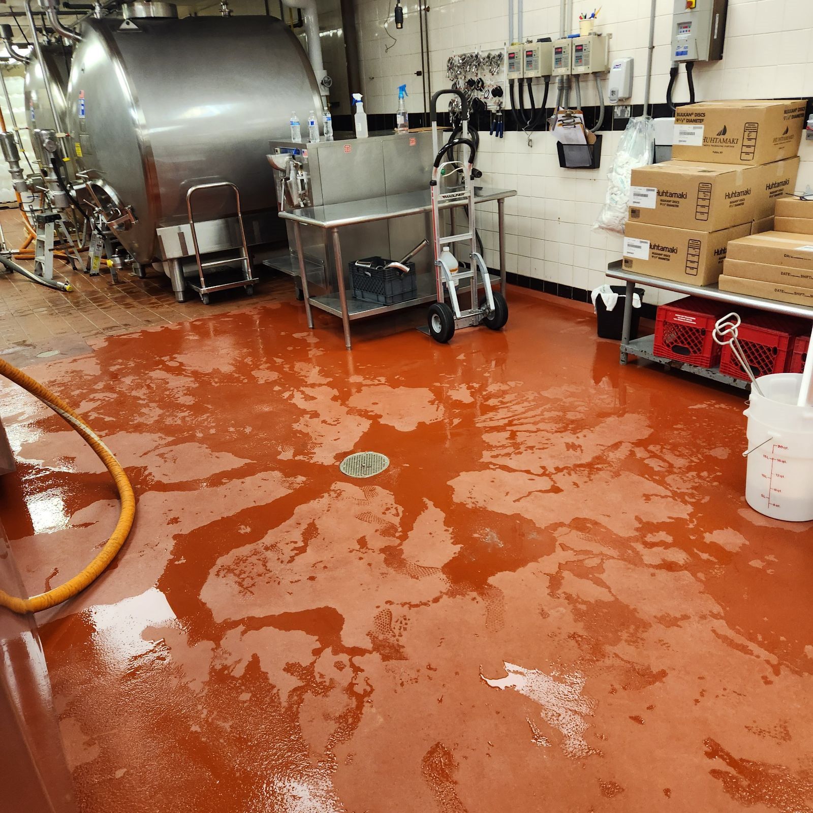 Urethane cement flooring installed in a washdown food processing environment.